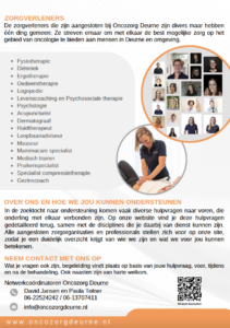 Wilt u graag onze flyers in uw wachtkamer hebben? Neem dan contact met ons op via e-mail info@oncozorgdeurne.nl of telefoon 0622524242, en wij zorgen ervoor dat u de flyers ontvangt.